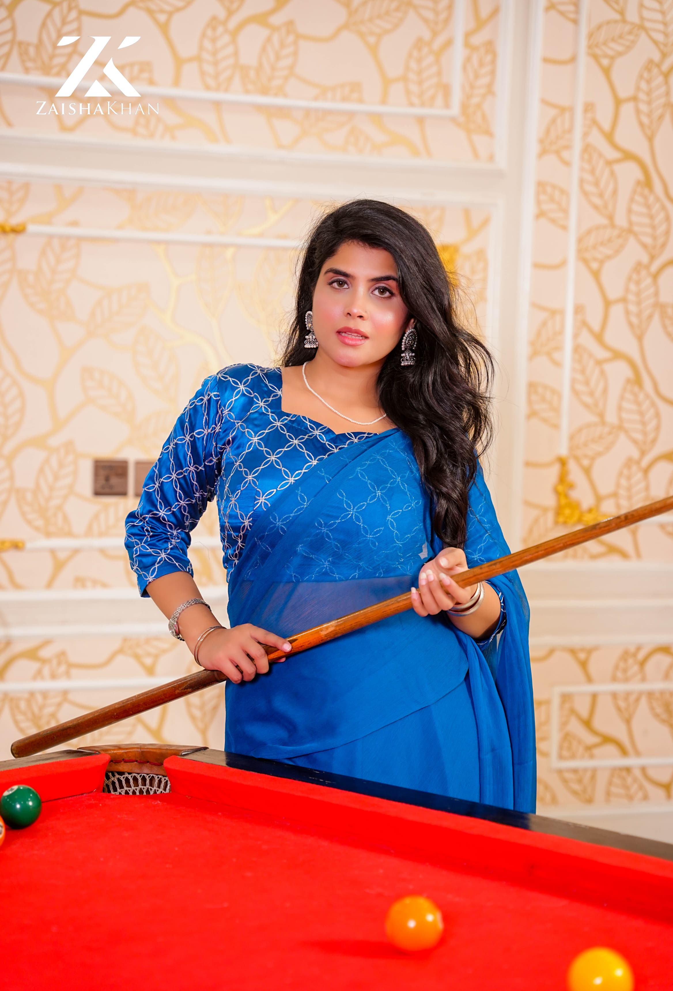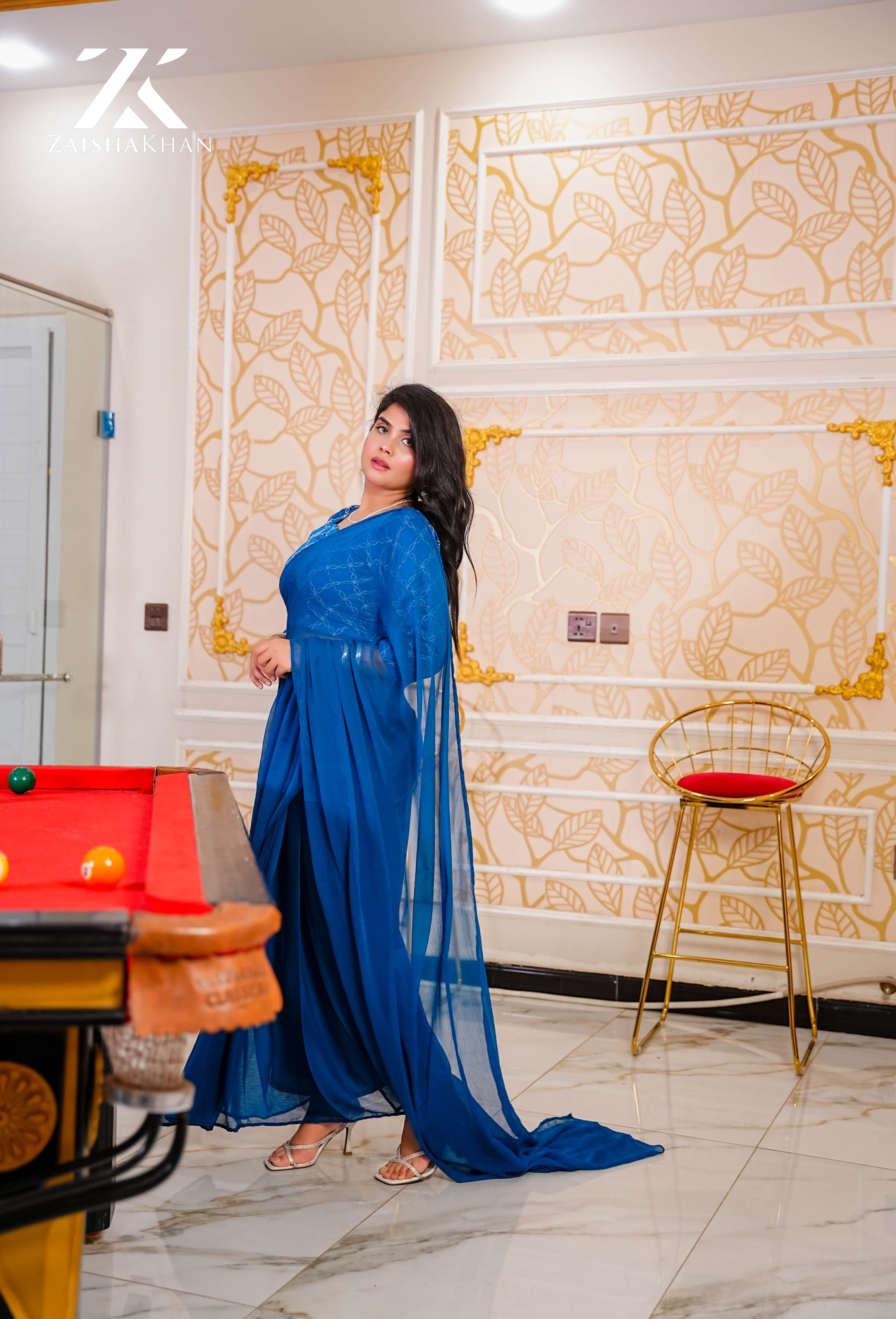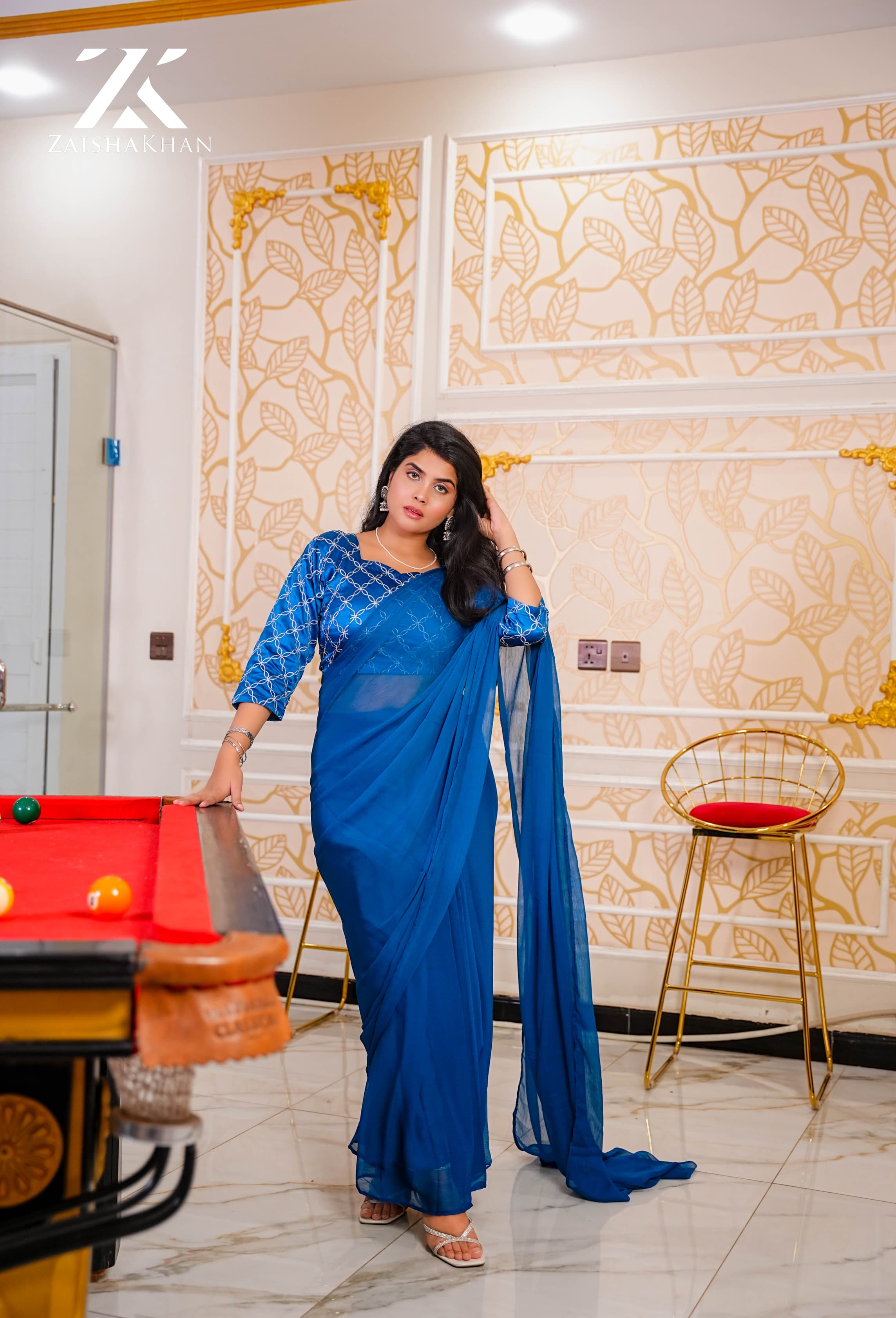 This classic royal blue saree is made from lightweight chiffon, offering a soft and flowy drape. The saree is paired with a beautifully embroidered blouse that adds an elegant and refined touch. Ideal for festive gatherings, formal events, and evening occasions, this saree delivers timeless sophistication with modern charm.